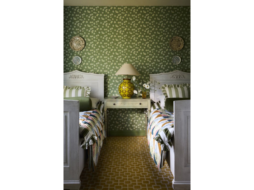 Motiv kopretiny patří k nejdéle používaným rostlinným vzorům v povrchovém designu - objevuje se v textilu, výšivkách, keramice i tapetách po celá staletí. Moon Daisies na tuto tradici navazuje, ale interpretuje ji současným, zjednodušeným způsobem. Název designu vychází z lidového pojmenování kopretiny (ox-eye daisy), která je známá tím, že odraží měsíční světlo podél venkovských cest a stezek v noci. Právě tento poetický moment se propsal do celého vzoru. Tapeta zobrazuje kopretiny s výraznými žlutými středy a jemně propojenými stonky, které vytvářejí klidný, plynulý rytmus. Design je volnou, modernější interpretací tapety z konce 19. století nalezené v Oxburgh Hall, historickém sídle spravovaném National Trust. Oproti původní předloze je Moon Daisies vědomě jednodušší, vzdušnější a lépe fungující v současných interiérech.