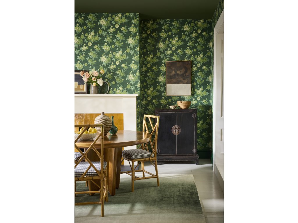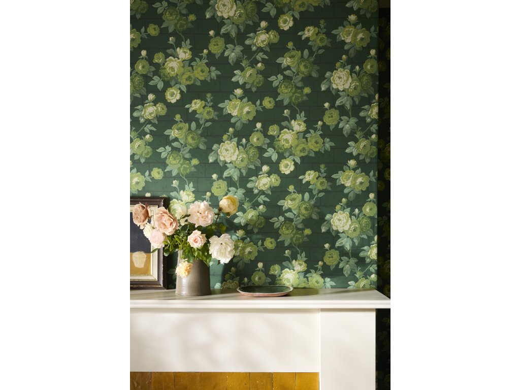 Vzor přenáší atmosféru starobylé růžové zdi s bujnými květy převislých růží zasazených do klidného pozadí. Výsledkem je dekorativní, ale vyvážený florální motiv, který krásně funguje jak ve velkých plochách, tak jako akcentní stěna.
